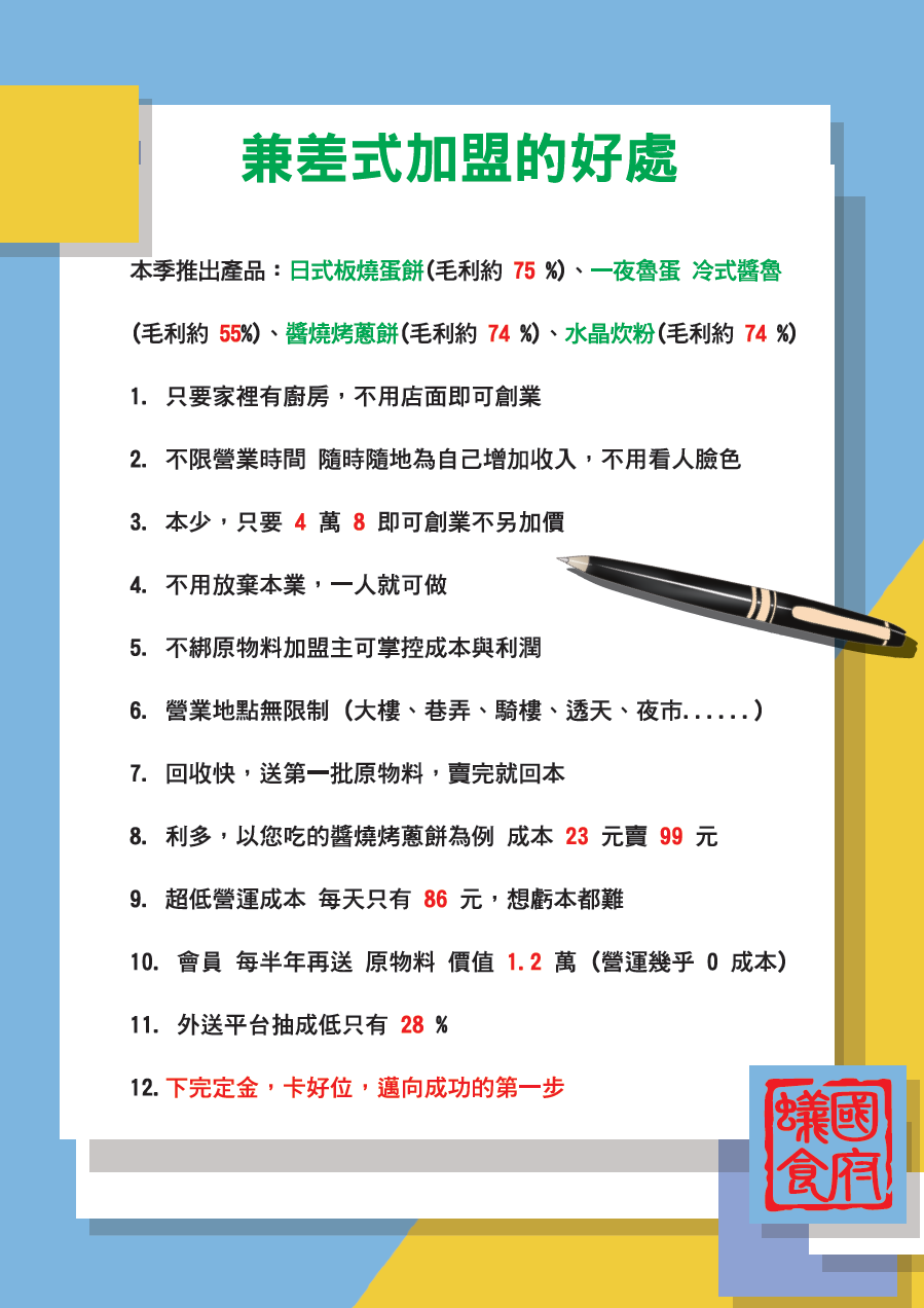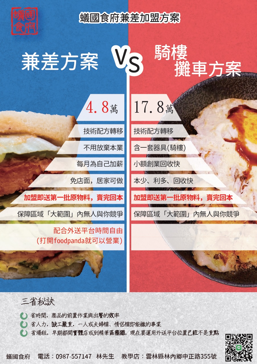 「兼差式加盟」,主打免店鋪、省人力、最小化營業成本、簡單的備餐流程以及最佳化的出餐效率之產品加盟方案,能夠將您的收入最大化,新手可當副業先嘗試,有店鋪的老闆可增加品項提高競爭力、提升利潤,對於希望為自己家新的夥伴們,歡迎來電洽詢!