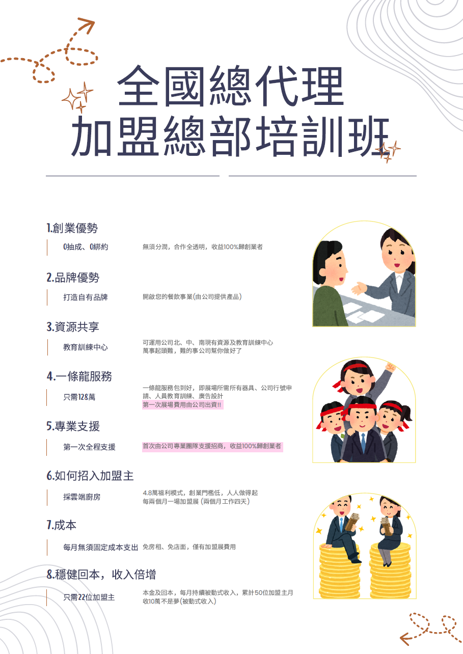 ● 加盟總部培訓班(全國總代理)➜ 適合想把事業做大同時也能擁有自己時間的人,加入培訓,讓您也可以擁有自己的加盟總部,並提供各種加盟事業所需資源,沒有產品可以做嗎 ? 我來提供給您!! 一條龍服務讓您快速上軌道!!